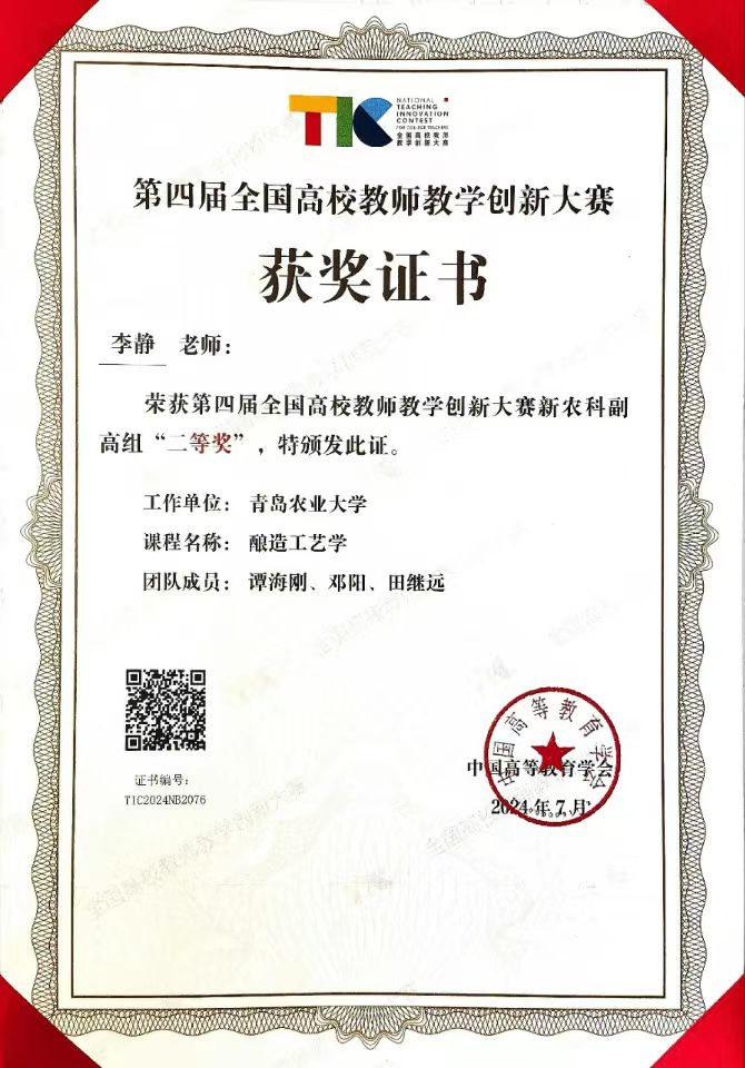 李静教授深耕教学二十载,紧密对接国家战略和行业需求,深度改革课堂,产教融合,打造了同频行业发展的教学内容,构建出以生产案例作为课堂发展主线的师生双链学习共同体教学模式。她主讲的《酿造工艺学》课程是第一批山东省级一流本科课程,荣获全国食品学科党建联盟优秀课程思政案例。教育教学期间,她与学生之间形成了紧密合作、相互促进的学习关系,营造了积极活跃的学习氛围,激发出学生的学习兴趣和创新思维,促进教学相长,提高了教育教学的质量和效果。