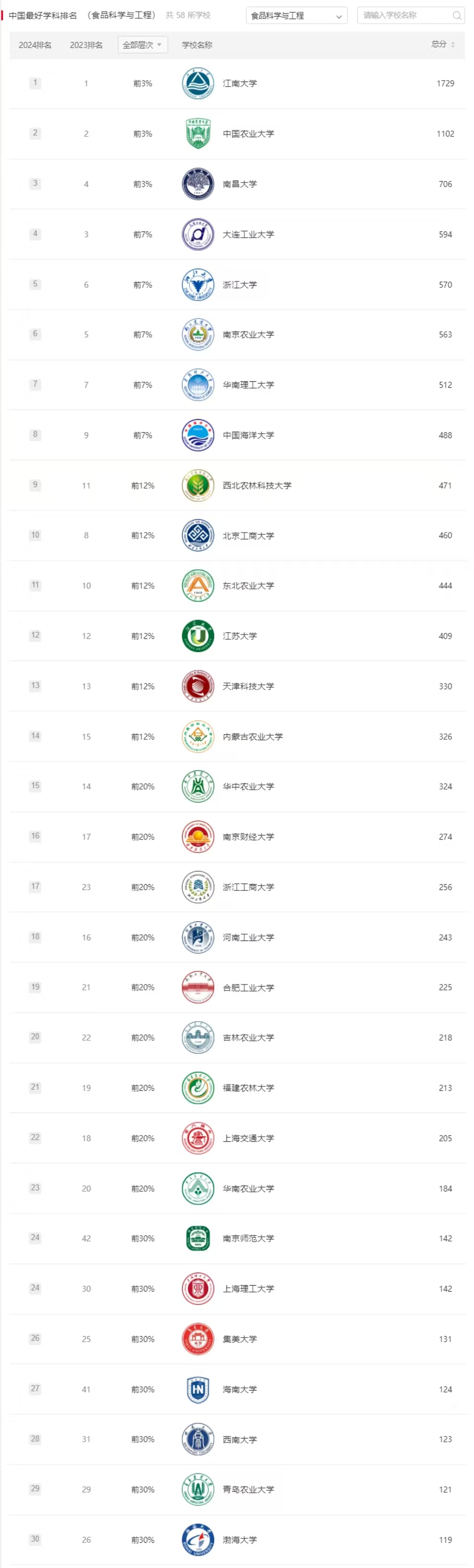 日前,2024“软科世界一流学科排名”和“软科中国最好学科排名”分别发布,我院“食品科学与工程”(代码0832)一级学科世界一流学科排名51-75位,全国排名位列第29。