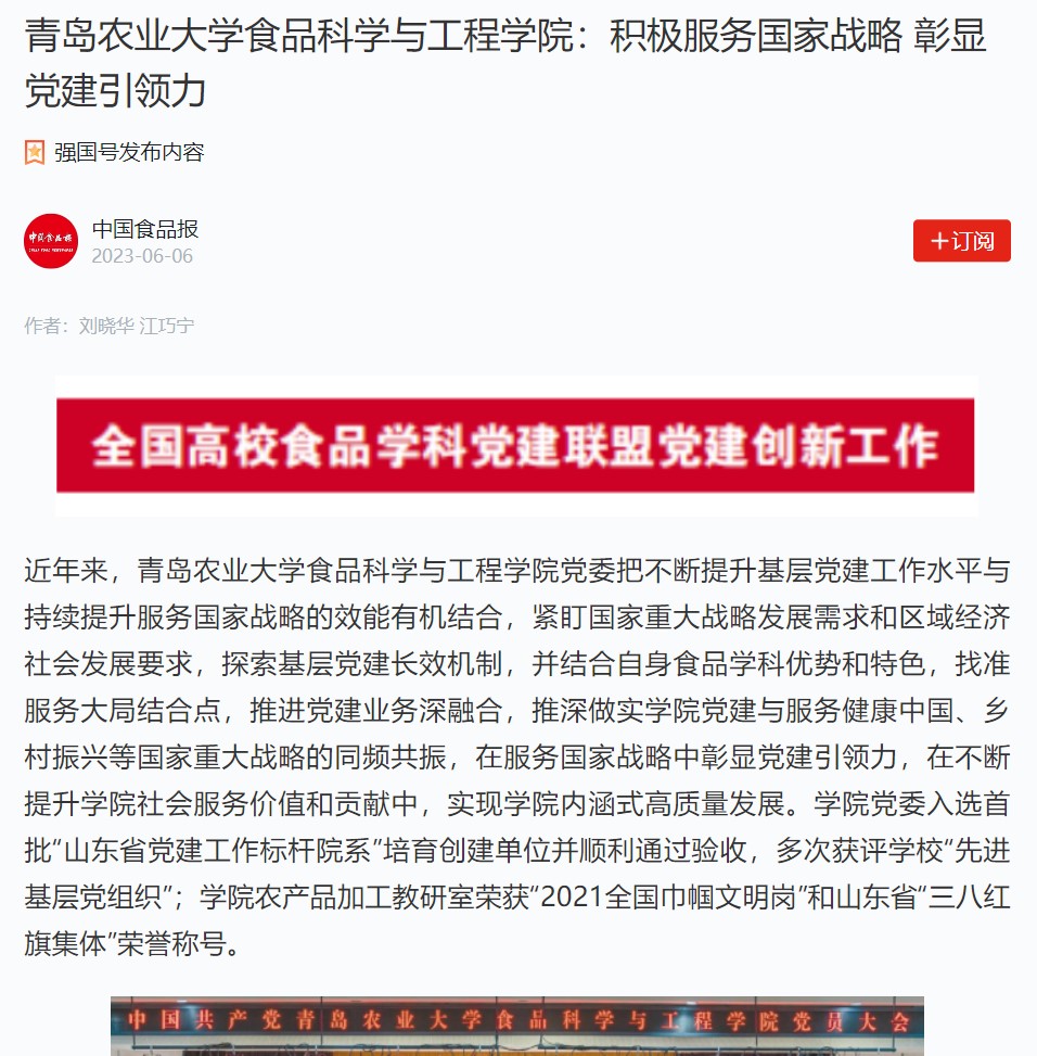 近年来,beat365在线体育官网党委把不断提升基层党建工作水平与持续提升服务国家战略的效能有机结合,紧盯国家重大战略发展需求和区域经济社会发展要求,探索基层党建长效机制,并结合自身食品学科优势和特色,找准服务大局结合点,推进党建业务深融合,推深做实学院党建与服务健康中国、乡村振兴等国家重大战略的同频共振,在服务国家战略中彰显党建引领力,在不断提升学院社会服务价值和贡献中,实现学院内涵式高质量发展。学院党委入选首批“山东省党建工作标杆院系”培育创建单位并顺利通过验收,多次获评学校“先进基层党组织”;学院农产品加工教研室荣获“2021全国巾帼文明岗”和山东省“三八红旗集体”荣誉称号。