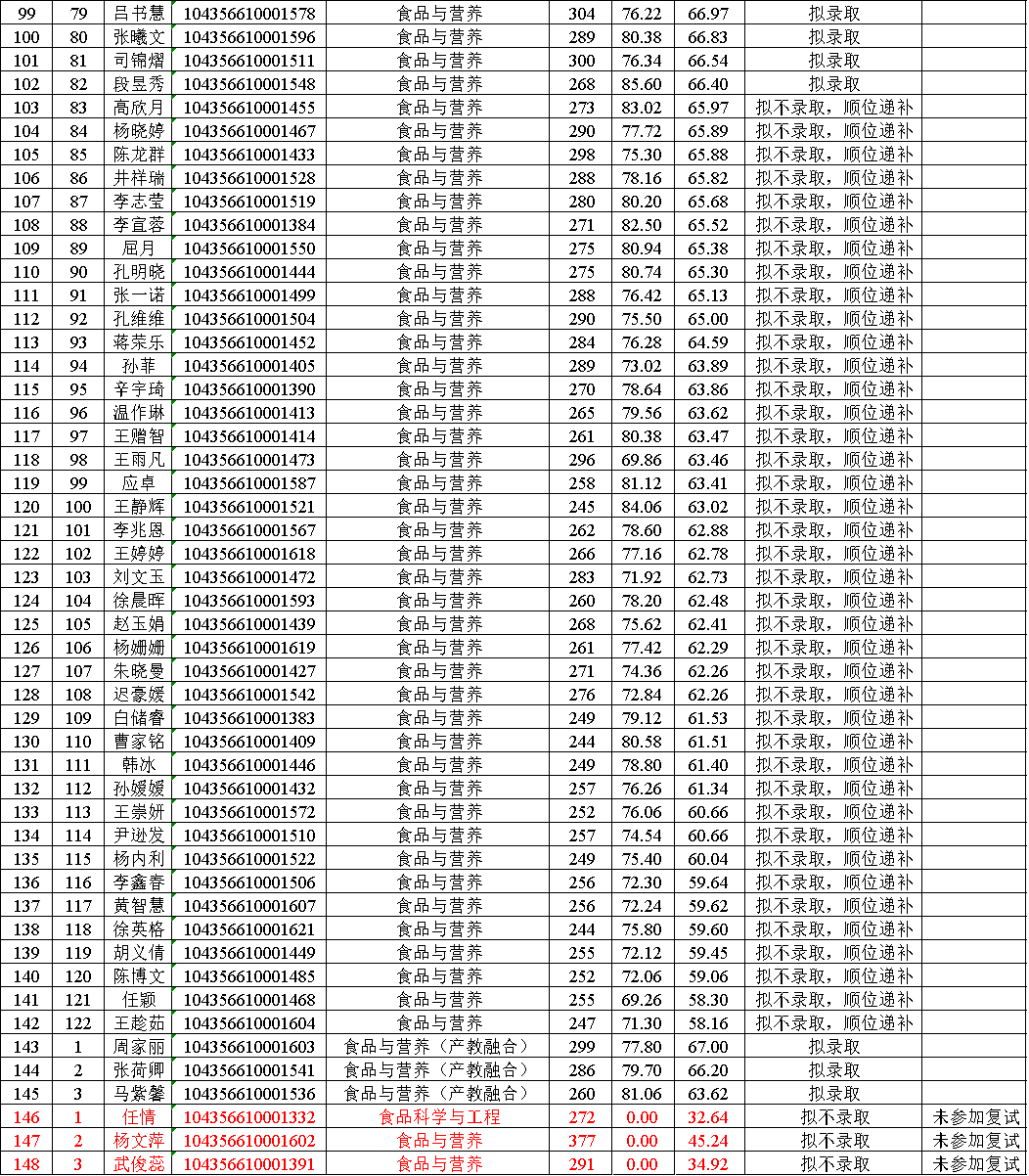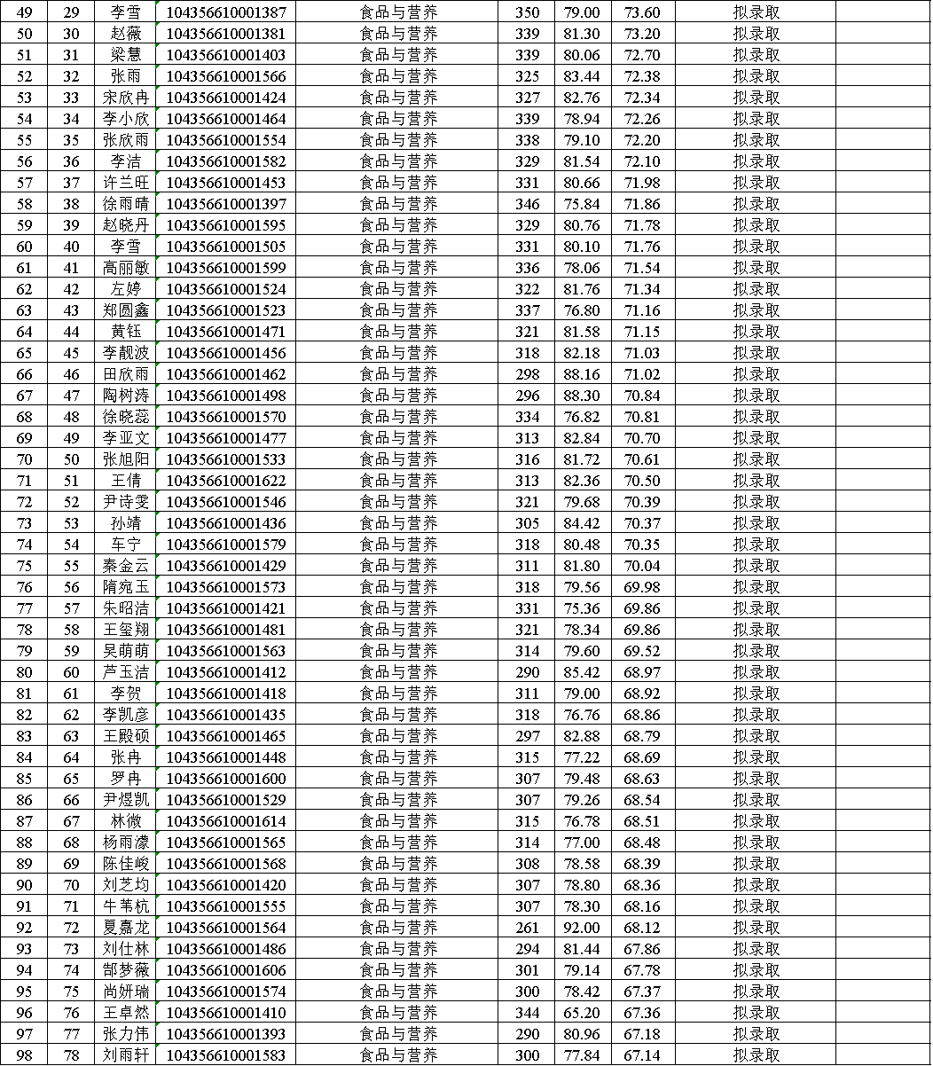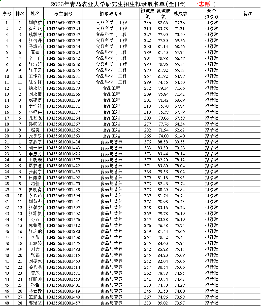 2026年食品学院研究生复试拟录取名单(全日制)