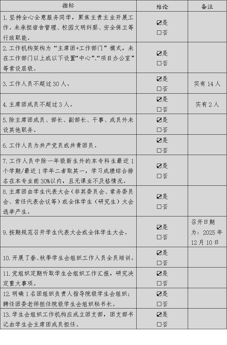 为落实共青团中央、教育部、全国学联联合下发的《关于推动高校学生会(研究生会)深化改革的若干意见》,并结合《关于巩固高校学生会(研究生会)改革成果的若干措施》文件要求,接受广大师生监督,现将我院2025年度学生会改革情况公开如下。