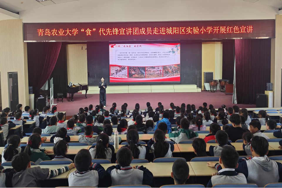 为深入学习贯彻党的创新理论,传承红色基因,推动大中小学思想政治教育一体化建设走深走实,引导青少年厚植爱国情怀、落实立德树人根本任务,4月14日,beat365在线体育官网“食”代先锋理论宣讲团走进城阳区实验小学,面向三年级全体少先队员开展“中国共产党人精神谱系”微党课宣讲活动。