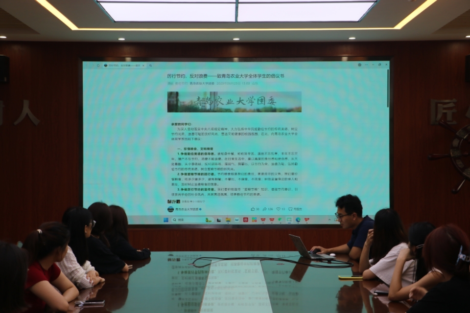 会议集体学习了厉行节约,反对浪费《致青岛农业大学全体学生的倡议书》内容。会上,大家围绕专业所学、结合自身,从小事做起,如何养成节约资源好习惯进行了热烈讨论。从实验室仪器旁的滴滴试剂,到餐厅餐盘中的粒粒粮食,从生产线上的精算配比,到流通环节的点滴守护,与会学生表示将以更炽热的专业担当,将“厉行节约、反对浪费”的理念深植血脉,用行动践行承诺,在科研攻关中精研节粮减损技术,在日常三餐中自觉践行光盘行动,在产业服务中积极推广绿色加工理念,为建设节约型校园、节约型社会贡献食品青年的青春力量。