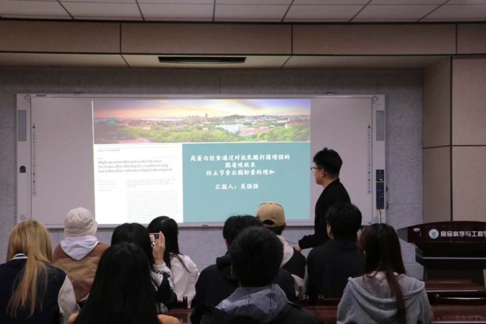 4月24日,食品学院在食品楼302举办第四十三期“食学研讲”活动。本次活动由食品加工与安全专业24级研究生吴强强主讲,主题为“高蛋白饮食通过抵消乳酸杆菌促进的脂质吸收,防止节食后脂肪量增加”。