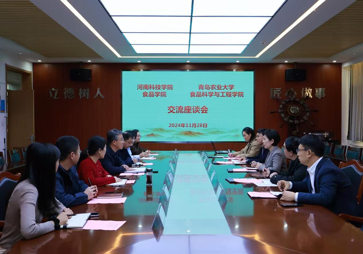座谈中,学院党委书记车广杰介绍了青岛农业大学历史沿革和建设发展情况,学院副院长肖军霞从学院历史、师资力量、专业设置、学科建设、科研和社会服务等方面介绍了学院的发展情况。河南科技学院食品学院院长李光磊介绍了河南科技学院办学历史以及食品学院的学科优势和人才培养特色。学院党委书记陈腾介绍了学院党建工作情况,希望双方党委以及师生党支部加强沟通交流,共同探索一融双高建设新路径。双方围绕人才培养、学科建设、专业工程认证、科研团队建设、校企合作、科研成果转移转化、文化品牌建设等进行了交流座谈。