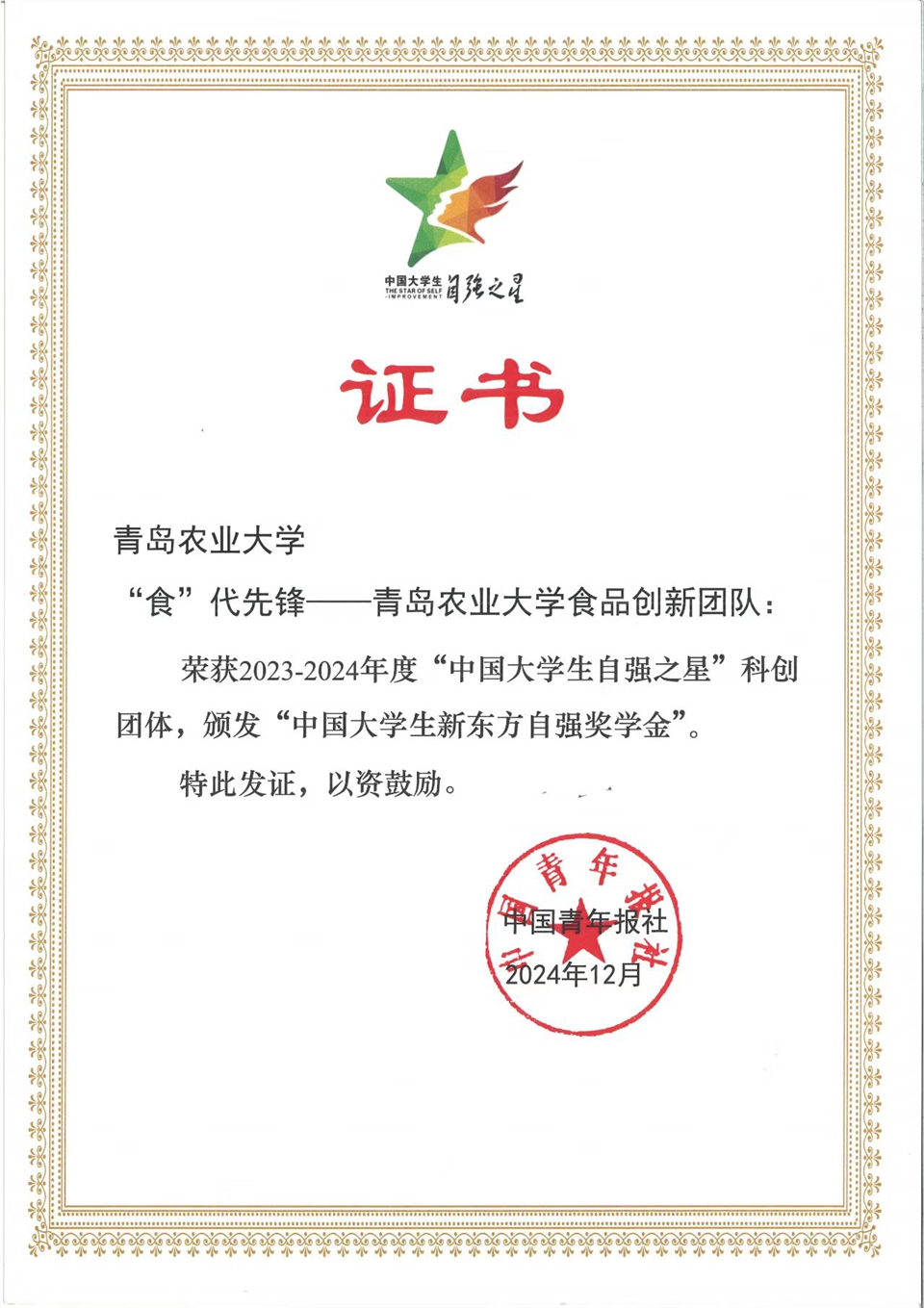 近日,2023—2024年度“中国大学生自强之星”奖学金评选结果揭晓,beat365在线体育官网“食”代先锋大学生食品创新团队榜上有名,获评2023-2024年度“中国大学生自强之星”科创团体、“中国大学生新东方自强奖学金”,全国共有100个大学生创新团队获此殊荣。