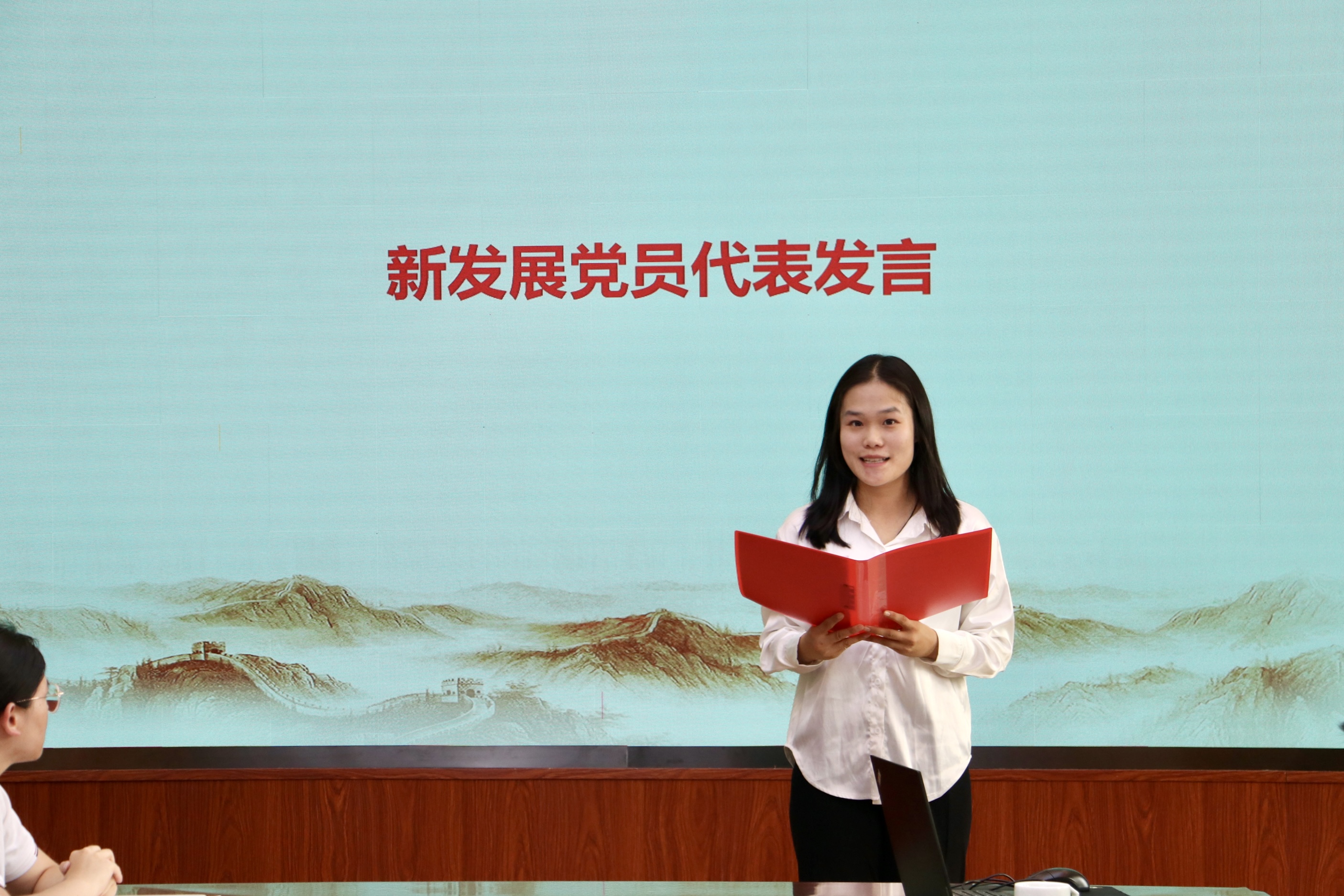 新发展预备党员代表、粮食工程2301班张一帆表明入党初心。结合专业使命,坚定表达听党话、跟党走的决心,立志将个人理想融入党和国家事业发展,勇担食品学子时代重任。
