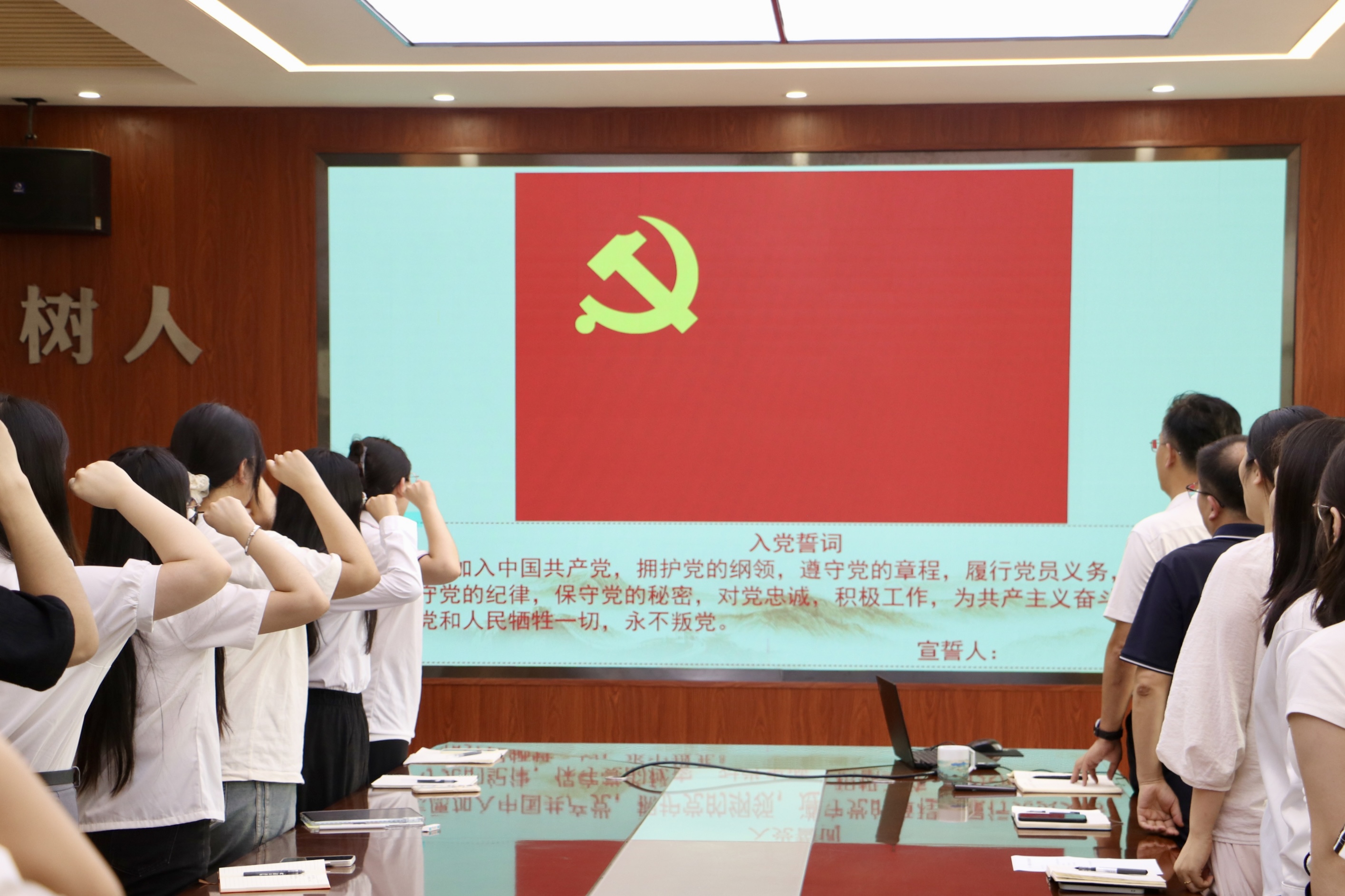 全体与会党员面向党旗庄严宣誓,许下为共产主义奋斗终身的铮铮誓言。