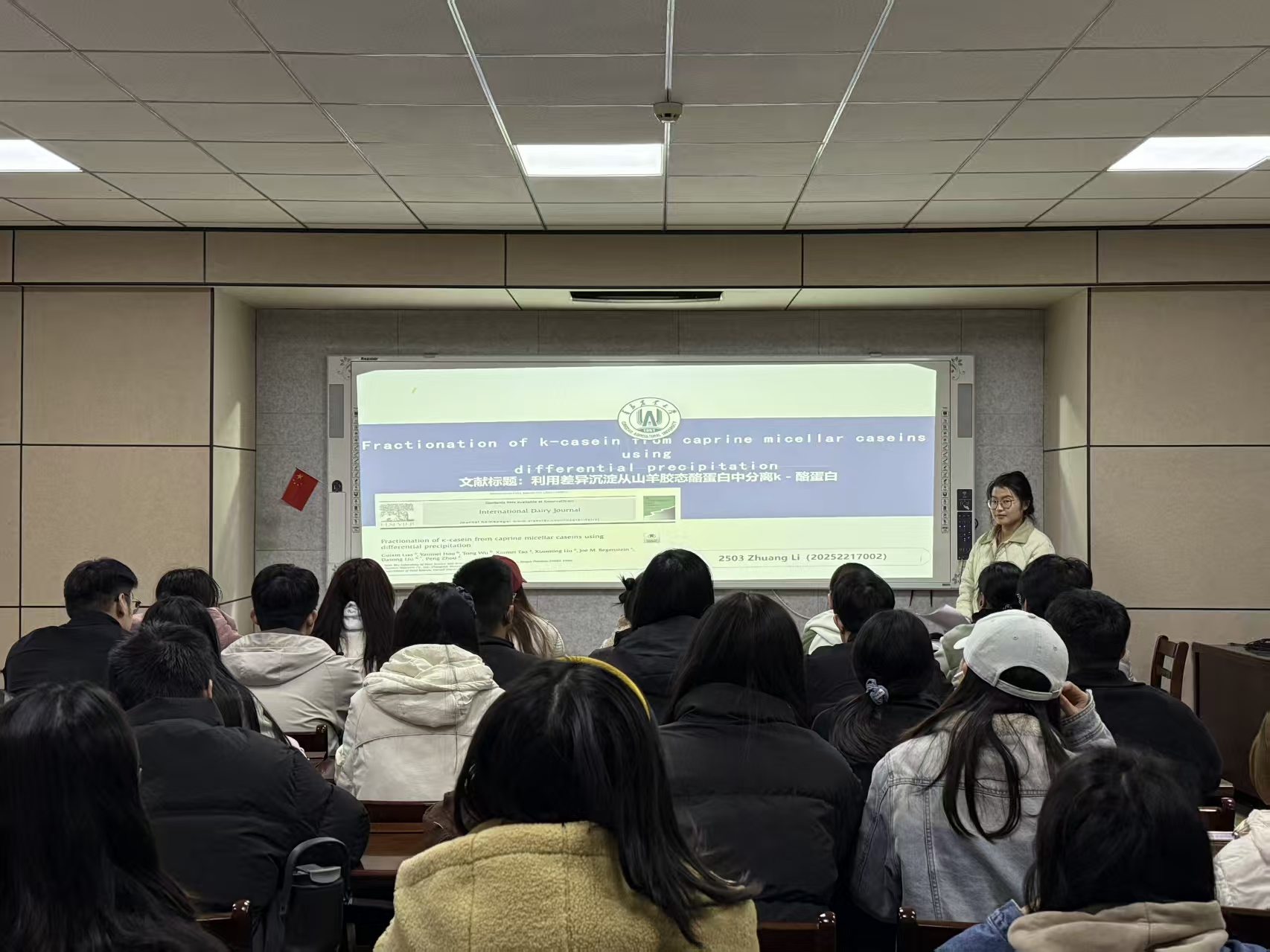 11月13日,食品学院在食品楼302举办第五十六期“食学研讲”活动。此次活动由食品科学与工程2503班庄丽主讲,主题为“利用差异沉淀法从山羊胶态酪蛋白中分离出κ-酪蛋白”。