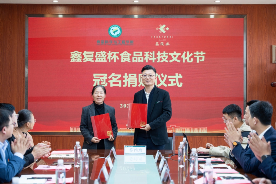 聚焦产学研深度合作和高质量发展,双方还签署了冠名捐赠协议,食品学院副院长肖军霞与鑫复盛集团副总经理、周钦公食品总经理高大明签署“鑫复盛杯”食品科技文化节冠名捐赠协议书。根据协议,自2025年起,鑫复盛集团连续3年捐资冠名青岛农业大学食品科技文化节,以此为平台,聚力推进食品学院人才培养等各项事业发展。食品学院副院长杨庆利向高大明副总经理颁发捐赠证书。