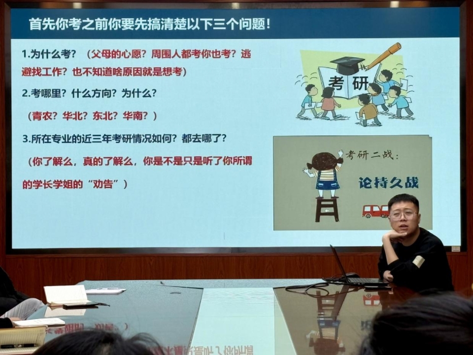 辅导员耿磊为学生干部做就业考研专题解析。耿磊立足食品专业特点,通过大数据分析展示了近三年毕业生的流向,横向对比了食品企业、检测机构等就业方向的市场需求,纵向梳理了考研院校选择、复试准备、调剂策略等关键节点,指导学生干部在服务同学的过程中同步做好自身职业规划,明确个人发展方向。