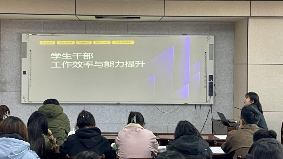 学院辅导员李振荣针对学生干部的工作效率和工作能力进行专题培训。从团队建设、沟通技巧、任务分配与时间管理等方面,系统阐述学生干部应具备的管理素养。李振荣强调,学生干部要以身作则,发挥模范带头作用,在日常工作中积累经验,不断提升组织协调与解决问题的能力。