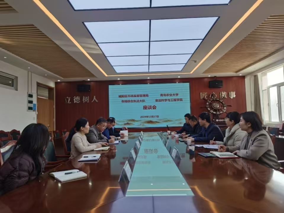 12月17日上午,青岛市城阳区市场监督管理局市场综合执法大队大队长蓝全传、副大队长徐立帅,正阳路市场监督管理所所长姜海生等一行5人到食品学院考察交流。食品学院党委书记车广杰、副书记刘晓华、副院长肖军霞、副院长杨庆利及系主任参加座谈。